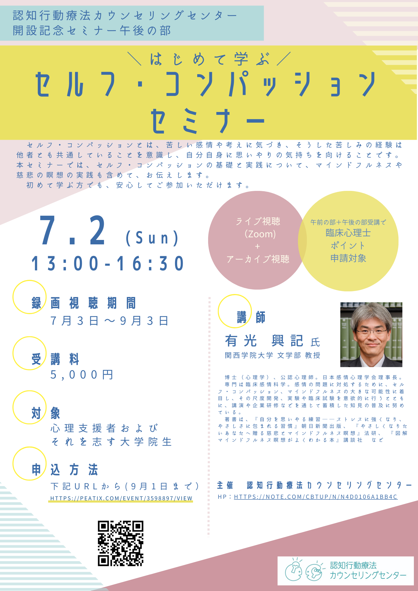 【認知行動療法カウンセリングセンター 開設記念セミナー午後の部】はじめて学ぶ、セルフ・コンパッションセミナー