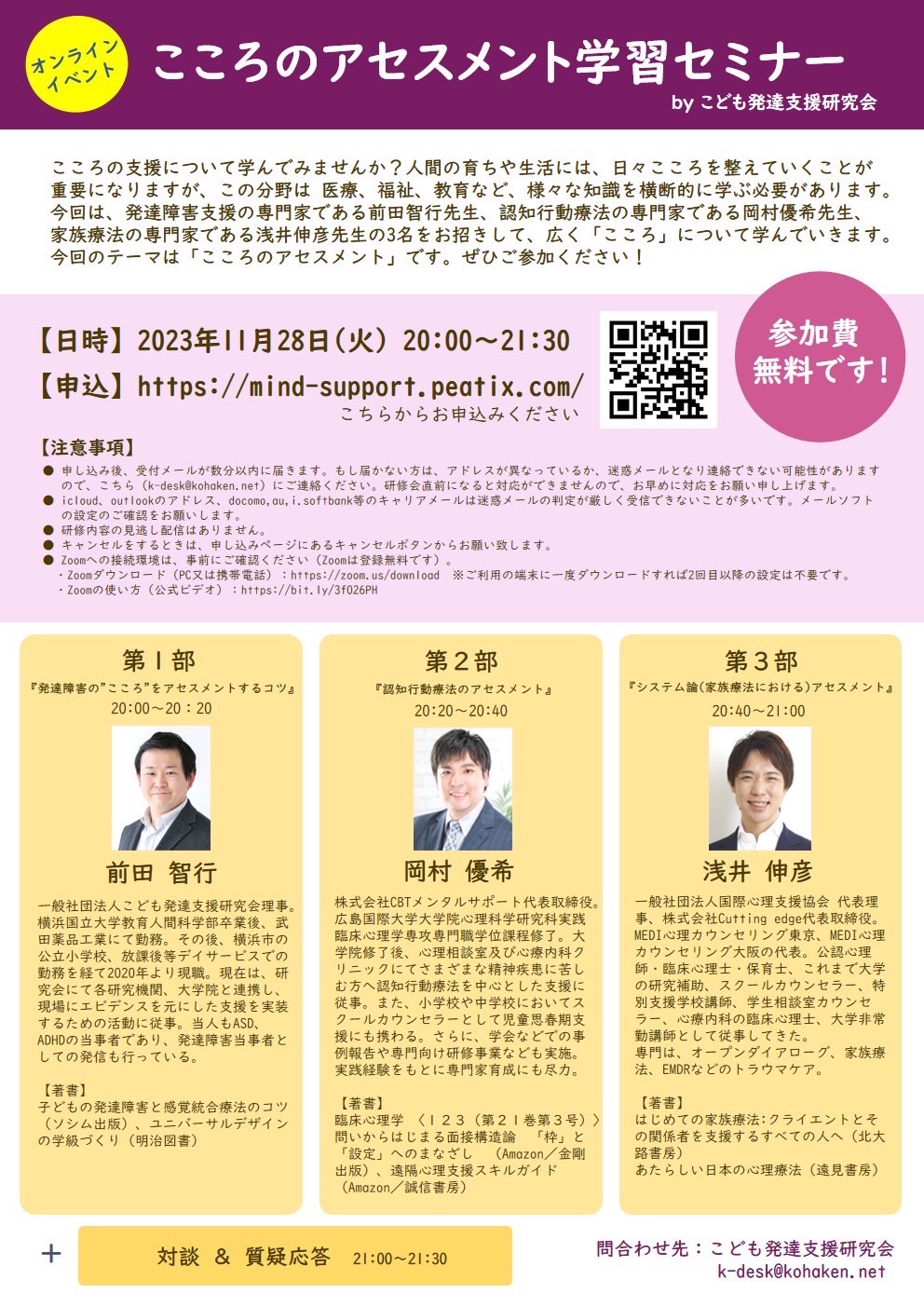 こころの支援について学んでみませんか?人間の育ちや、生活には日々、こころを整えていくことが重要になりますが、この分野は、医療、福祉、教育など、様々な分野の知識を横断的に学ぶ必要があります。今回は、発達障害支援の専門家である前田智行先生、認知行動療法の専門家である岡村優希先生、家族療法の専門家である、浅井伸彦先生の3名をお招きして、広く「こころ」について学んでいきます。今回のテーマは、「こころのアセスメント」です。ぜひご参加ください!
