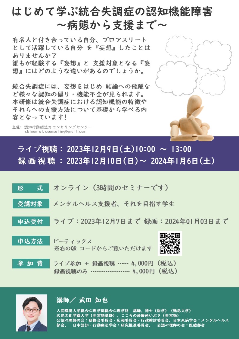統合失調症には、妄想をはじめ 結論への飛躍など様々な認知の偏り・機能不全が見られます。本研修は統合失調症における認知機能の特徴や それらへの支援方法について基礎から学べる内容となっています!
