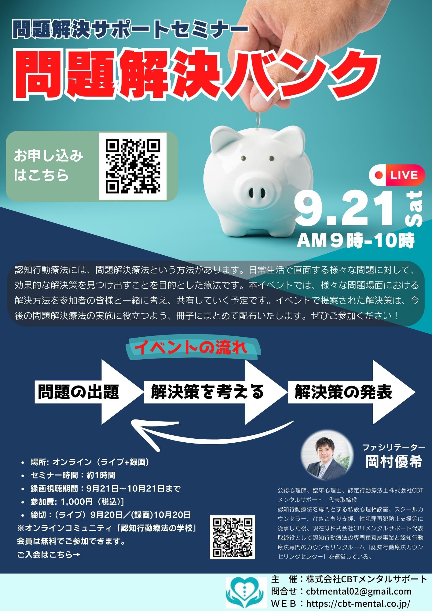 認知⾏動療法には、問題解決療法という⽅法があります。⽇常⽣活で直⾯する様々な問題に対して、効果的な解決策を⾒つけ出すことを⽬的とした療法です。本イベントでは、様々な問題場⾯における解決⽅法を参加者の皆様と⼀緒に考え、共有していく予定です。イベントで提案された解決策は、今後の問題解決療法の実施に役⽴つよう、冊⼦(データ)にまとめて配布いたします。ぜひご参加ください!