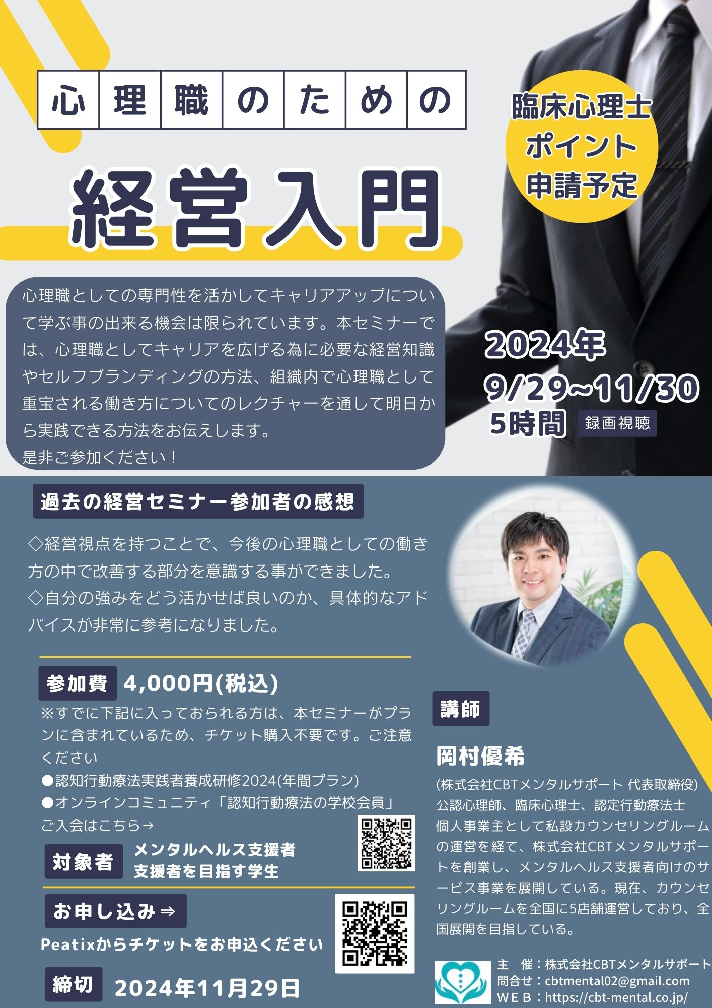 ⼼理職としての専⾨性を活かしてキャリアアップについて学ぶ事の出来る機会は限られています。本セミナーでは、⼼理職としてキャリアを広げる為に必要な経営知識やセルフブランディングの⽅法、組織内で⼼理職として重宝される働き⽅についてのレクチャーを通して明⽇から実践できる⽅法をお伝えします。是⾮ご参加ください!