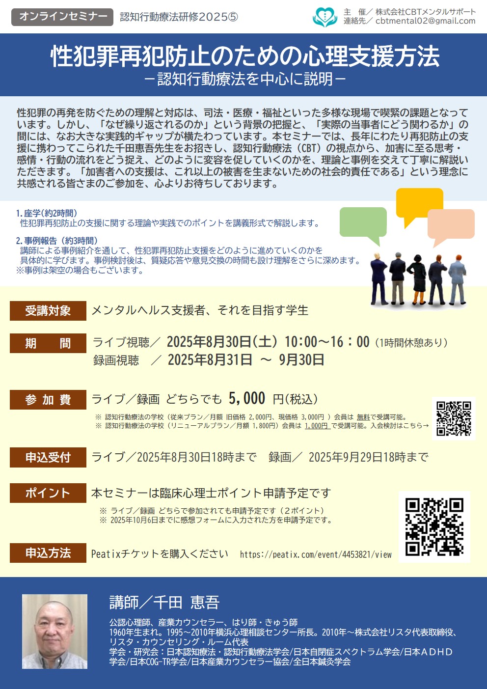 性犯罪の再発を防ぐための理解と対応は、司法・医療・福祉といった多様な現場で喫緊の課題となっています。しかし、「なぜ繰り返されるのか」という背景の把握と、「実際の当事者にどう関わるか」の間には、なお大きな実践的ギャップが横たわっています。本セミナーでは、長年にわたり再犯防止の支援に携わってこられた千田恵吾先生をお招きし、認知行動療法(CBT)の視点から、加害に至る思考・感情・行動の流れをどう捉え、どのように変容を促していくのかを、理論と事例を交えて丁寧に解説いただきます。「加害者への支援は、これ以上の被害を生まないための社会的責任である」という理念に共感される皆さまのご参加を、心よりお待ちしております。