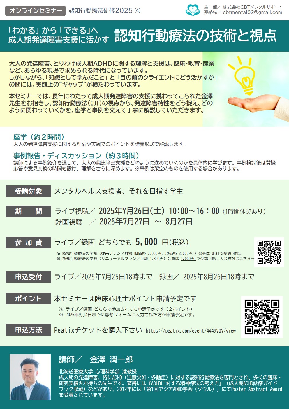 本セミナーでは、長年にわたって成人期発達障害の支援に携わってこられた金澤先生をお招きし、認知行動療法(CBT)の視点から、発達障害特性をどう捉え、どのように関わっていくかを、座学と事例を交えて丁寧に解説していただきます。