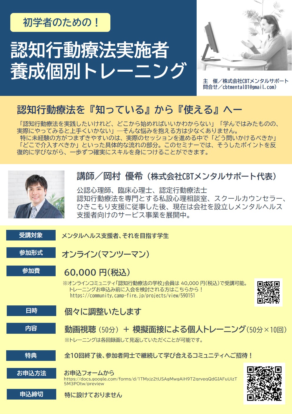 ※オンラインコミュニティ「認知行動療法の学校」会員は 40,000 円(税込)で受講可能。トレーニングお申込み前に入会を検討される方はこちらから!