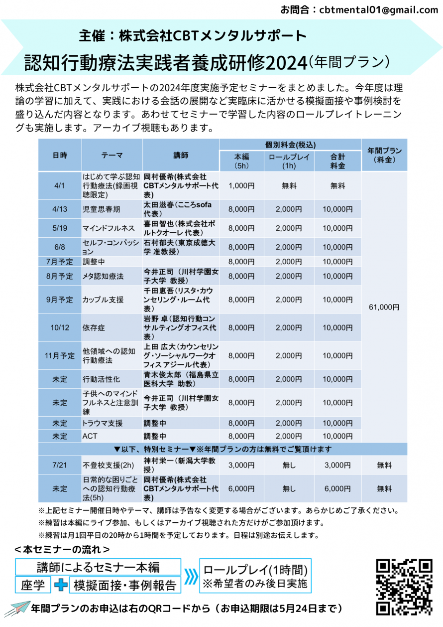 ※本セミナーを含めた全15本のセミナーを半額以下の料金で受けて頂く事のできる認知行動療法実践者養成研修2024(年間プラン)もございます。詳細は以下公式ページにて。